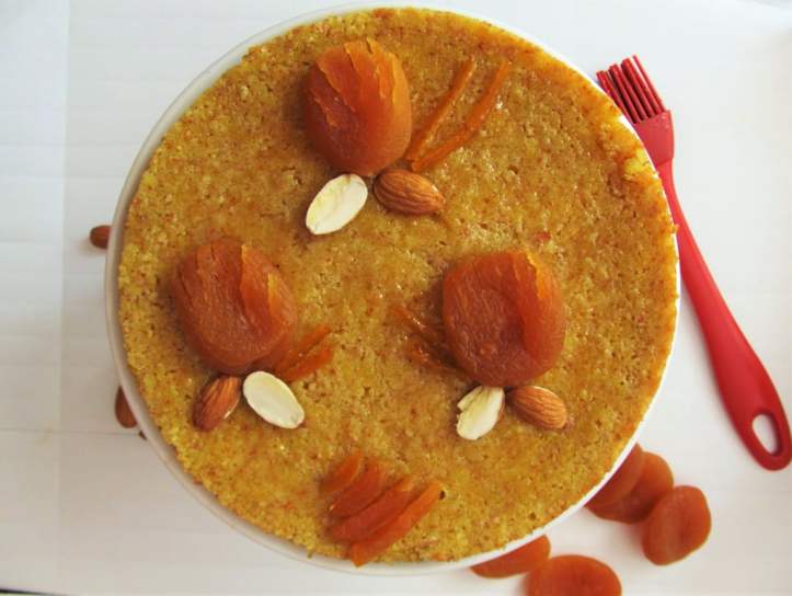 Put the chopped oranges without the seeds but with the skin into a pan with 2-3 tbsp of water and cook it covered, for 20-25 minutes. Preheat the oven to 160 degrees Celsius and use a springform cake tin lined with parchment paper. Beat the egg whites with half the sugar till stiff peaks are formed. Beat the yolks with the rest of the sugar. Grind the softened oranges into a thick paste ( with some chunks, not too fine) Fold it into the yolk-sugar mix. Fold the ground almonds into the above mix. Slowly transfer and fold in the beaten egg whites into this mix. Transfer this into the springform cake tin. Bake for 50-55 minutes. Take it out of the springform tin after it cools off completely Garnish with dried apricots and sliced almonds. The cooking of the oranges with the peel is what adds to the overall flavour intensity !
