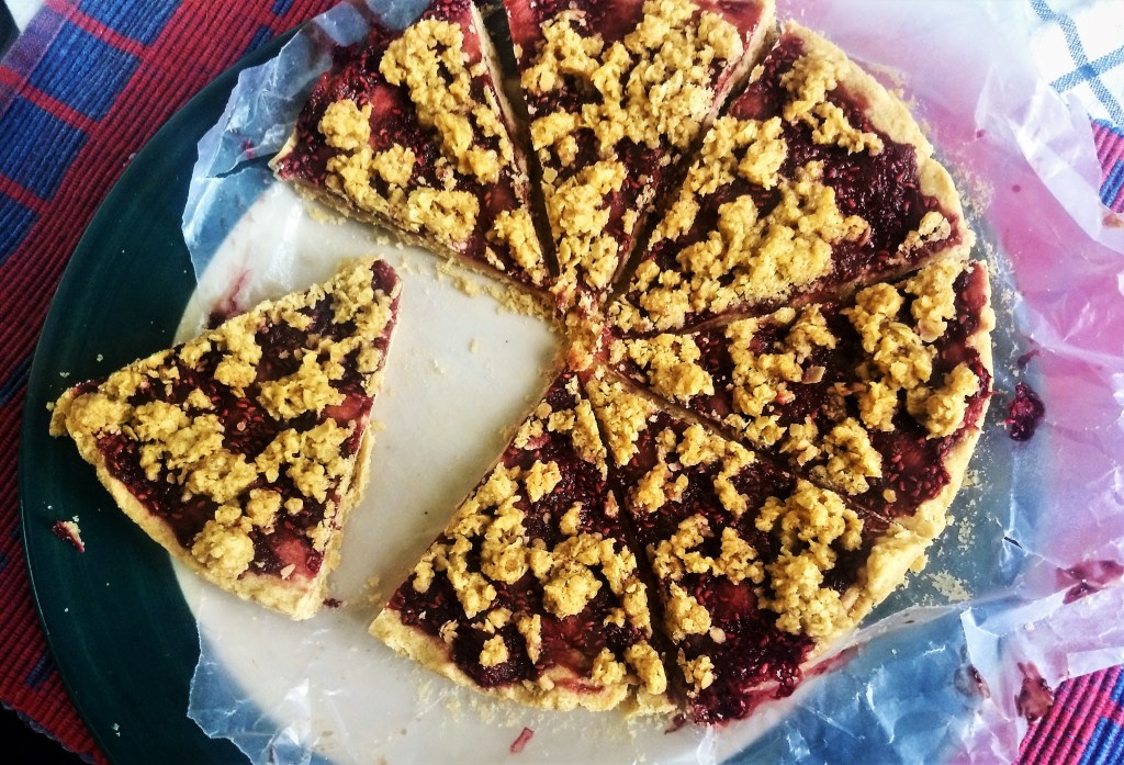 Whisk the oats, cane sugar and wholewheat flour together. Add the butter and rub it into the mix so that it resembles coarse bread crumbs. Sprinkle this over the raspberry compote and then bake for 35 minutes at the same temperature.