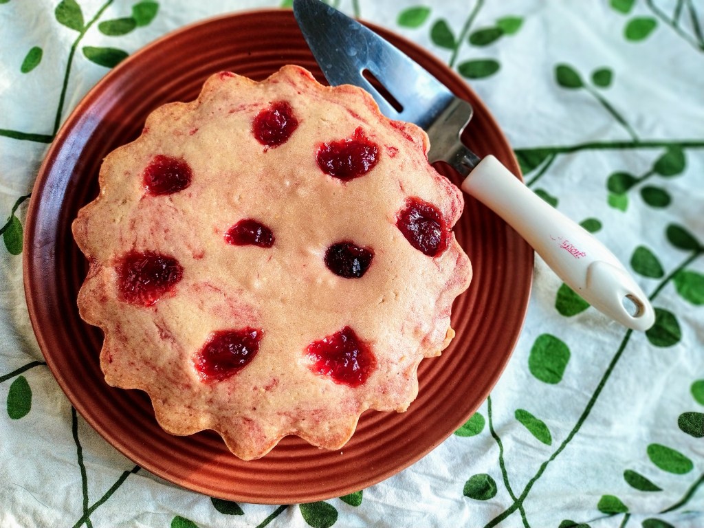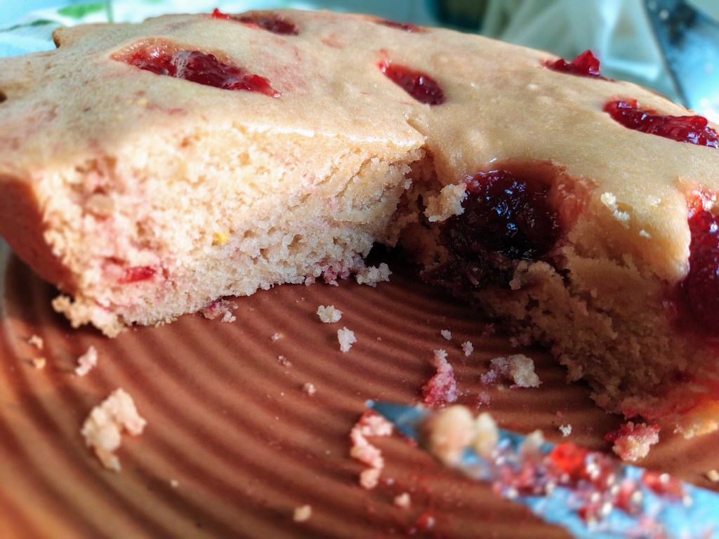 And so here it is – Wholewheat Cake with strawberry compote and orange peel powder. Not as fancy as it sounds – just optimal usage of the things I made to preserve flavours of these fruits for using in bakes. It contains raw unrefined sugar.