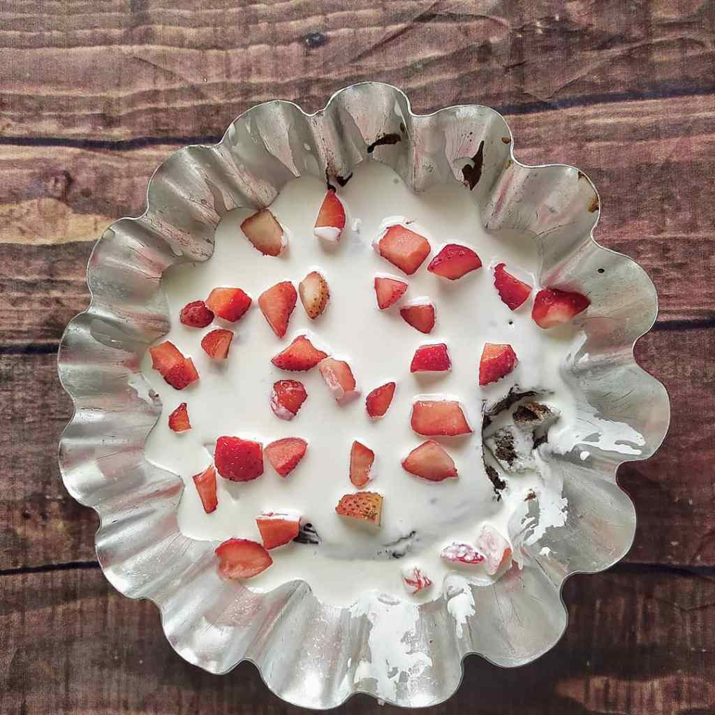 We used a very simple topping – unsweetened cream that was whisked to fluff it up a bit and fresh strawberries.