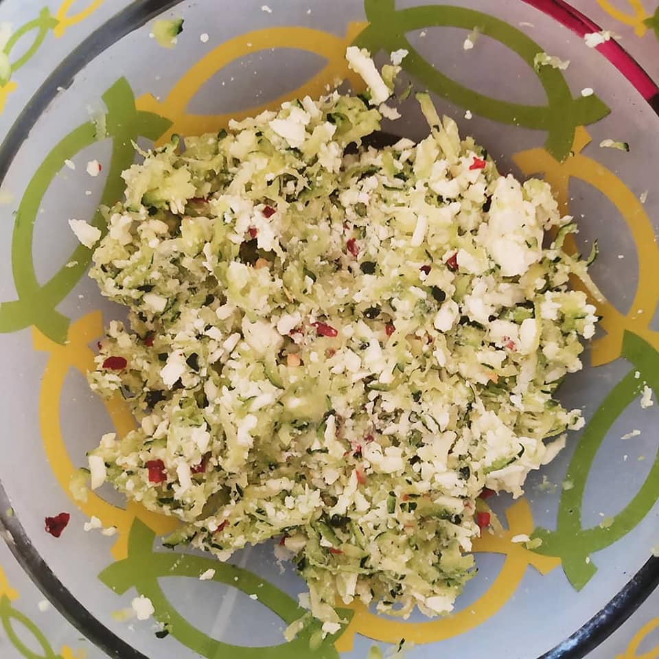 - Mix the zucchini, crumbled cottage cheese, flakes, rock salt and seeds flour.